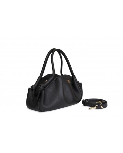 Bolso de piel en color negro con diseño estructurado y efecto fruncido, asas acolchadas y correa ajustable. Sofisticado y versátil, perfecto para destacar en cualquier ocasión.